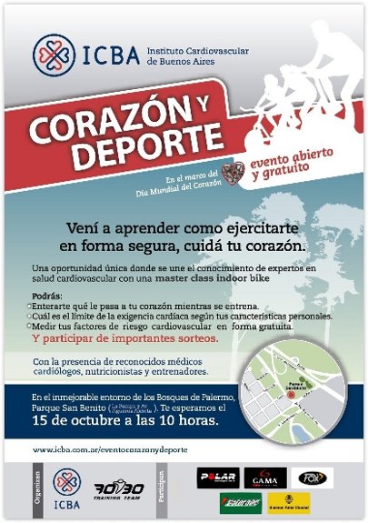El ICBA celebra el Día Mundial del Corazón con un evento deportivo único donde se une el conocimiento de expertos en salud cardiovascular con una master class de indoor bike 15 de octubre-10 hs-Parque San Benito (La Pampa y Figueroa Alcorta) Evento Abierto y gratuito Las enfermedades cardiovasculares, como el infarto de miocardio y el accidente cerebrovascular, son las causas de muerte más importantes del mundo. Se pierden por esta causa unas 17 millones de vidas al año y se calcula que en 2015 morirán alrededor 20 millones de personas por enfermedades cardiovasculares. En colaboración con la Organización Mundial de la Salud (OMS), la Federación Mundial del Corazón organiza en más de 100 países y para celebrar el Día Mundial del Corazón, eventos para controles de salud, caminatas organizadas, carreras, sesiones de gimnasia, charlas públicas, representaciones teatrales, foros científicos, exposiciones, conciertos, festivales y torneos deportivos. Este año, el ICBA organiza para el 15 de octubre, un evento deportivo único en donde se podrá presenciar y aprender cómo ejercitarse en forma segura, cuidando el corazón; se podrá conocer cuál es el límite de la exigencia cardíaca según las características personales y además se medirán los factores de riesgo cardíaco en forma gratuita. Será un encuentro en donde se unirán el conocimiento de expertos en salud cardiovascular con una master class de indoor bike. 15 de octubre-10hs Entrada libre y gratuita-Figueroa Alcorta y Pampa Presenciá una Master Class de indoor bike y controlá factores de riesgo en forma gratuita Importantes sorteos www.icba.com.ar/eventocorazonydeporte Organiza ICBA y 70 30 (Training Team)