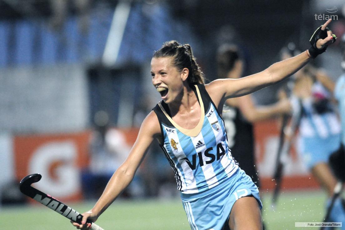 DELFINA MERINO GRITA EUFÓRICA SU TANTO (FUE LA GOLEADORA DEL EQUIPO ARGENTINO EN EL TORNEO) EN EL TRIUNFO DE LAS LEONAS POR 5-1 A NUEVA ZELANDA EN LA FINAL DE LA WORLD LEAGUE.