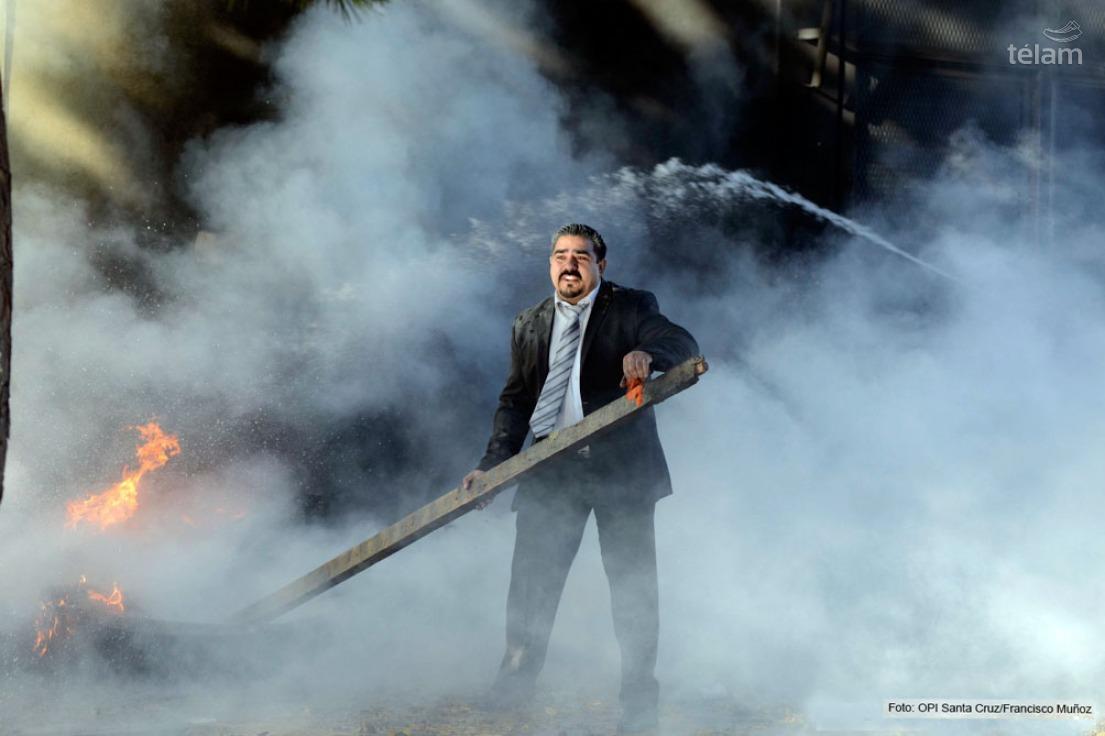 Un integrante de la seguridad privada de Diputados de Santa Cruz durante los incidentes provocados por gremialistas, que pretendieron ingresar a la sesión para tratar un nuevo endeudamiento en Santa Cruz